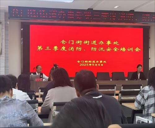2025年9月4日,西寧市喜再緣賓館派員參加了西寧市倉門街街道辦事處舉辦的2025年第三季度消防、防汛安全培訓會。會議主旨:強化汛期安全意識,提升應急處突能力,確保旅客與員工生命財產安全,保障賓館在汛期平穩有序運營。